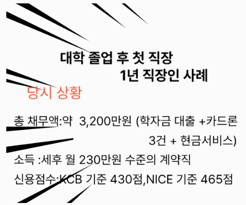 - 총 채무액: 약 3,200만 원 (학자금 대출 + 카드론 3건 + 현금서비스)